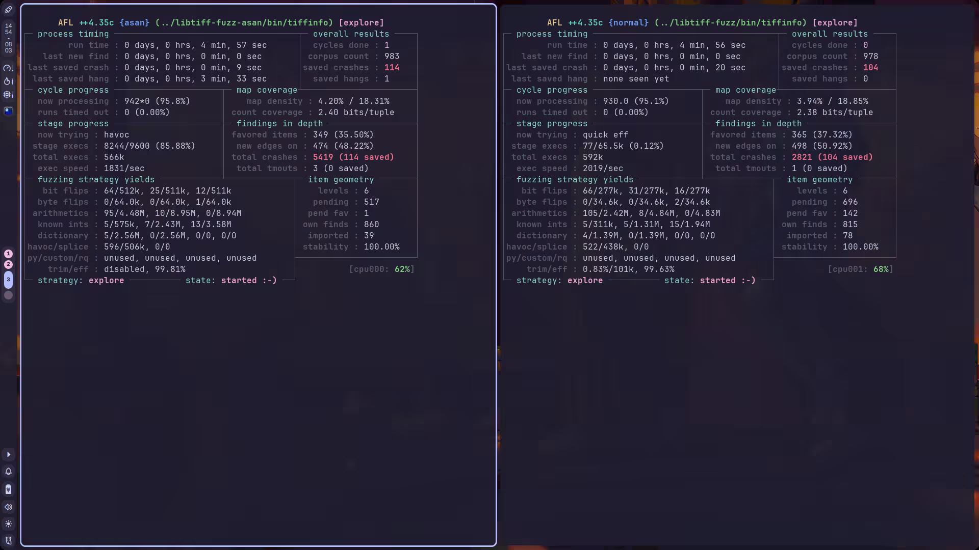 AFL_TMPDIR=/dev/shm/normal \afl-fuzz -i corpus \ -o outs \ -m none \ -S normal \ -- ../libtiff-fuzz/bin/tiffinfo -Dcjrsw @@刚跑了两分钟,ASAN 那个线程以每秒一百多 crashes 的速度产出……吓坏了(