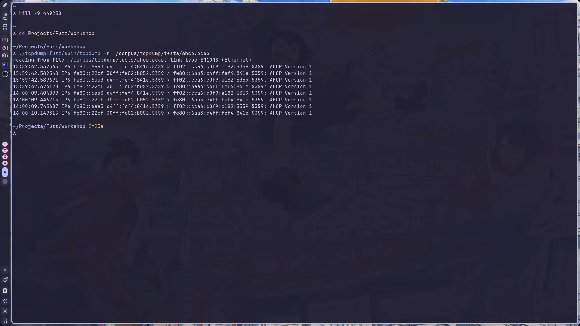 make cleanAFL_USE_ASAN=1 \CC=afl-clang-lto \CXX=afl-clang-lto++ \CFLAGS="-Wno-error=implicit-int" \CXXFLAGS="$CFLAGS" \LDFLAGS="-L$(realpath ../workshop/libpcap-fuzz/lib)" \CPPFLAGS="-I$(realpath ../workshop/libpcap-fuzz/include)" \./configure \ --prefix="$(realpath ../workshop/tcpdump-fuzz)" \ --with-system-libpcapAFL_USE_ASAN=1 make -j`nproc` && AFL_USE_ASAN=1 make installSamples
