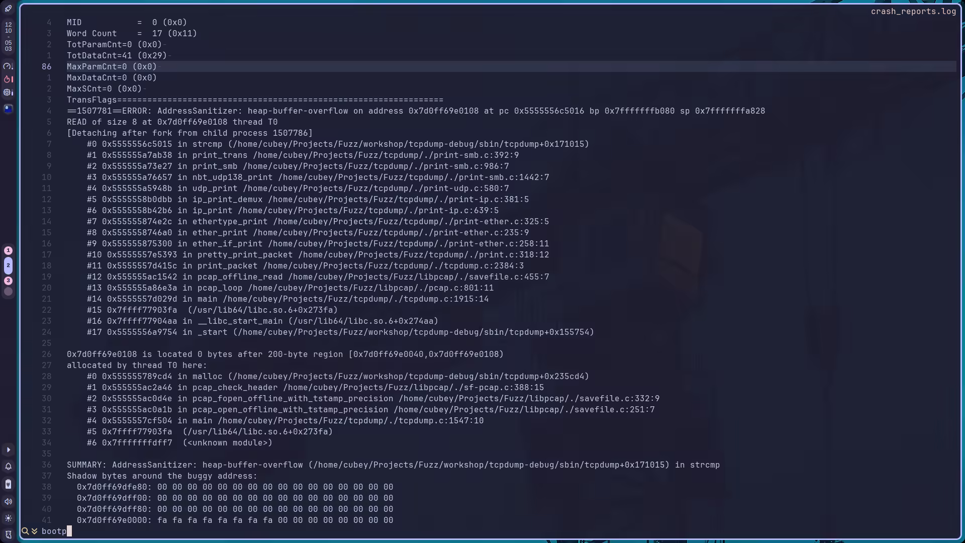 CC=clang \CXX=clang++ \CFLAGS="-O0 -g -fno-inline -fno-builtin -fno-omit-frame-pointer \ -Wno-error=implicit-int \ -fsanitize=address" \CXXFLAGS="$CFLAGS" \LDFLAGS="-L$(realpath ../workshop/libpcap-debug/lib)" \CPPFLAGS="-I$(realpath ../workshop/libpcap-debug/include)" \./configure \ --prefix="$(realpath ../workshop/tcpdump-debug)" \ --with-system-libpcap然后看看第一个 crash: