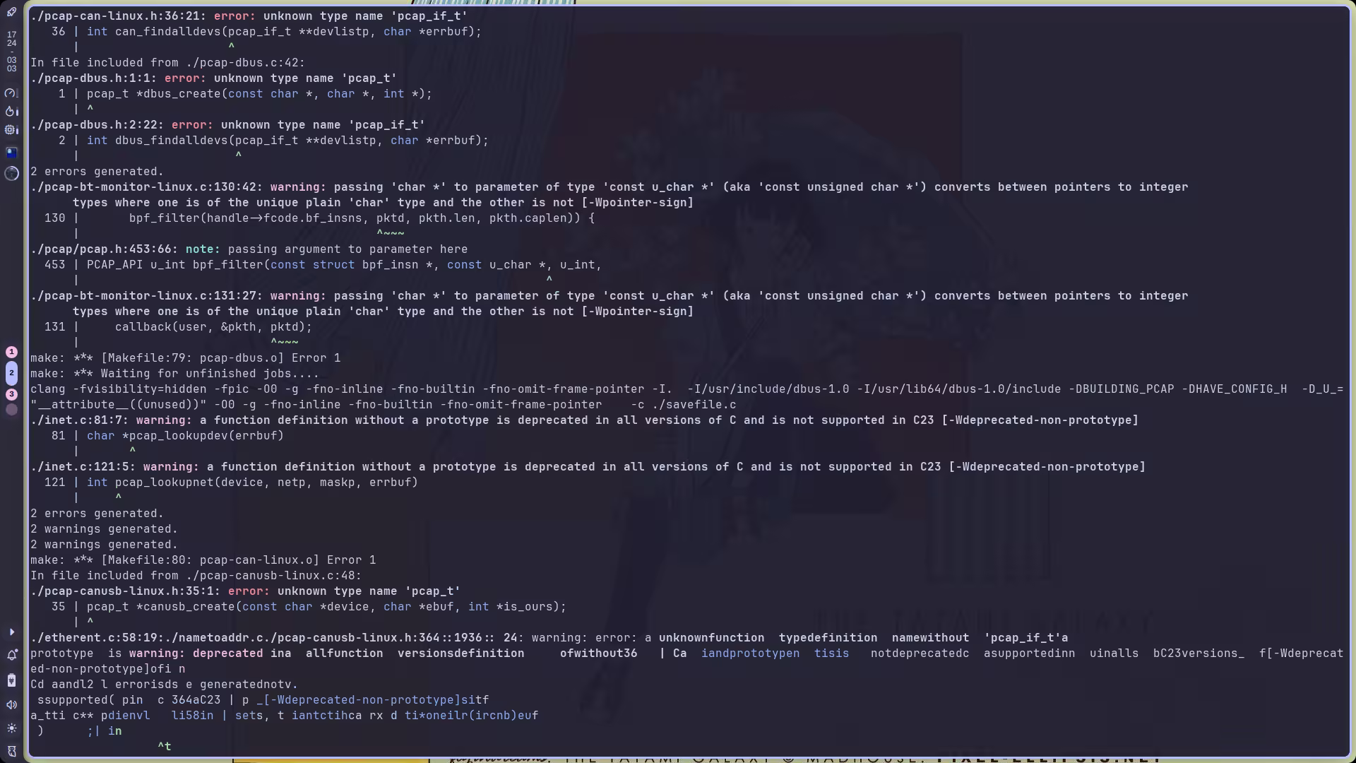 CC=clang \CXX=clang++ \CFLAGS="-O0 -g -fno-inline -fno-builtin -fno-omit-frame-pointer \ -Wno-error=implicit-int" \CXXFLAGS="$CFLAGS" \LDFLAGS="-L$(realpath ../workshop/libpcap-debug/lib)" \CPPFLAGS="-I$(realpath ../workshop/libpcap-debug/include)" \./configure \ --prefix="$(realpath ../workshop/tcpdump-debug)" \ --with-system-libpcap现在 configure 阶段是通过了,make 一下,又是一堆报错: