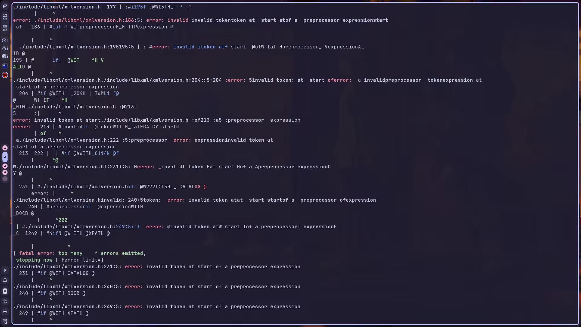 看了一圈,报错原因全都是因为 invalid token at start of a preprocessor expression,而这个错误的产生又是因为 .in 文件中 @@ 占位多了一个空格,比如 @WITH_PUSH @,把那个空格去掉即可。