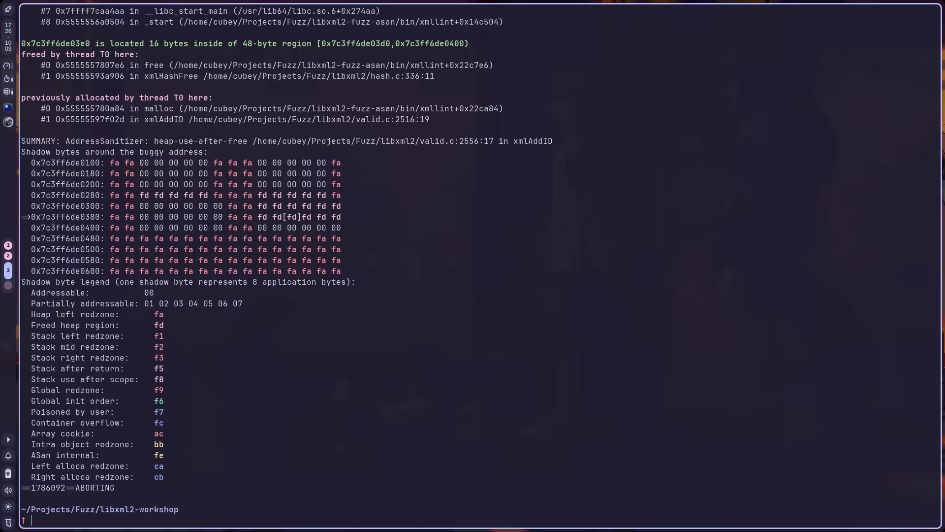 为了检查插桩是否成功,可以使用 ASAN_OPTIONS=help=1 ../libxml2-fuzz-asan/bin/xmllint,或者查看符号:nm ../libxml2-fuzz-asan/bin/xmllint | rg -i asan。