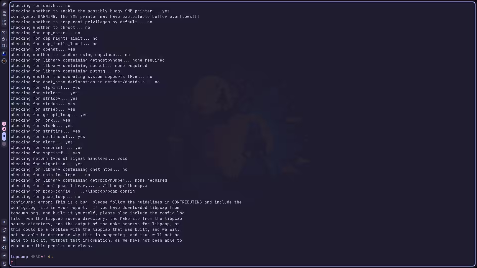 CC=afl-clang-lto CXX=afl-clang-lto++ ./configure --enable-shared=no --prefix="$(realpath ../workshop/libpcap-fuzz)" --disable-bluetooth --disable-dbusmake -j`nproc` && make install接下来编译 tcpdump,遇到如下报错: