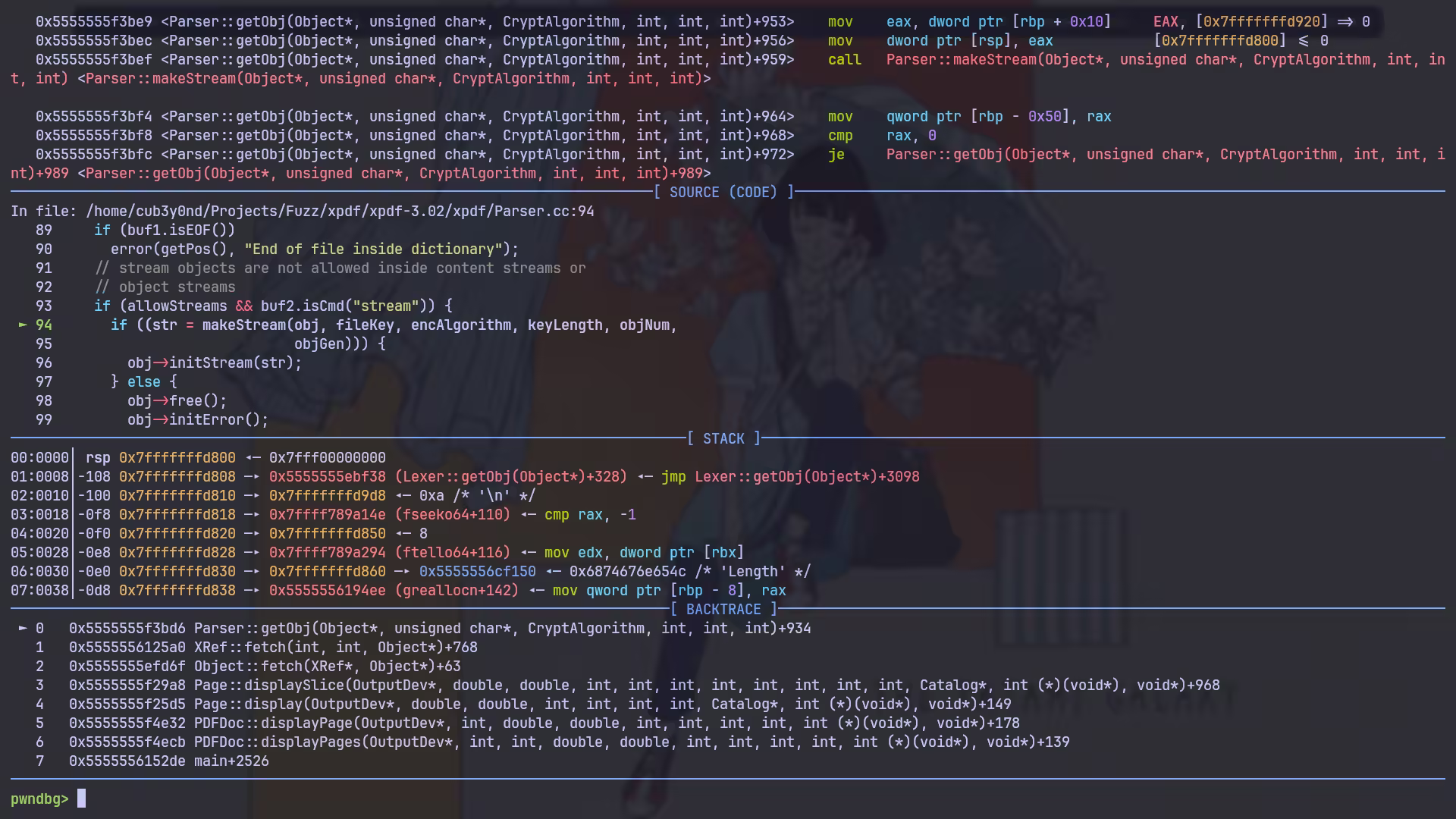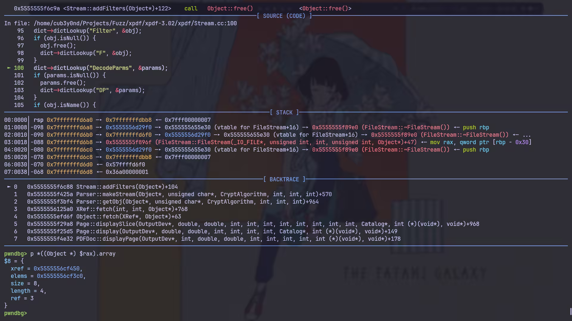 根据上面的截图,我们不难发现,在执行 Parser::getObj 时反复使用了 objNum=7, objGen=0 作为参数,而 Object::fetch 和 XRef::fetch 的调用虽然早于 Parser::getObj,并且也在后续 backtrace 中重复出现,但从名字来看就知道,它们只是用于转发参数的函数,而不是真正创建 / 重入对象的函数,所以,我们应该从 Parser::getObj 开始分析,暂且认为它是递归环入口。