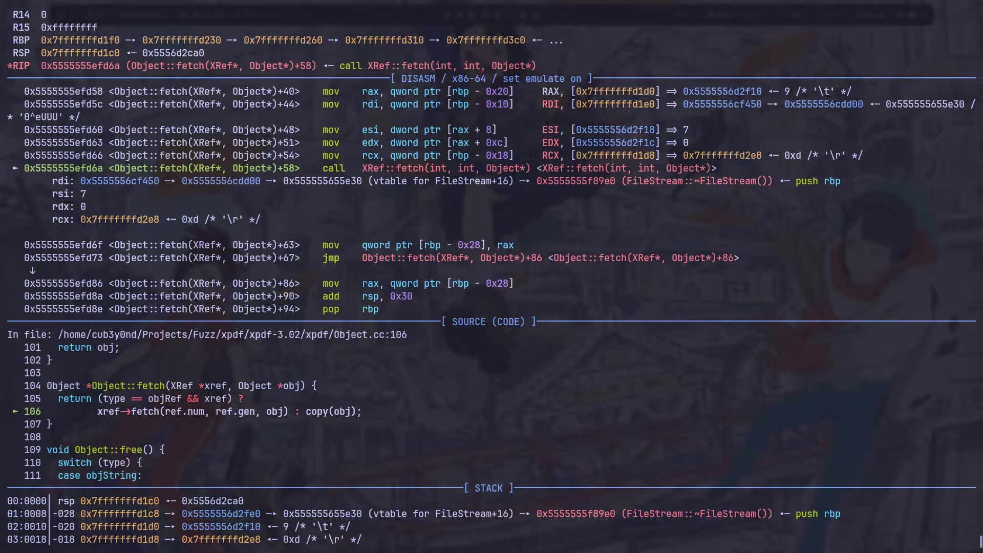 最后,返回到 Object::fetch 后由于 type == objRef && xref 成立,导致再次 fetch 了 (objNum=7, objGen=0),如此循环,陷入无限递归,最终耗尽了栈空间,BOOM!