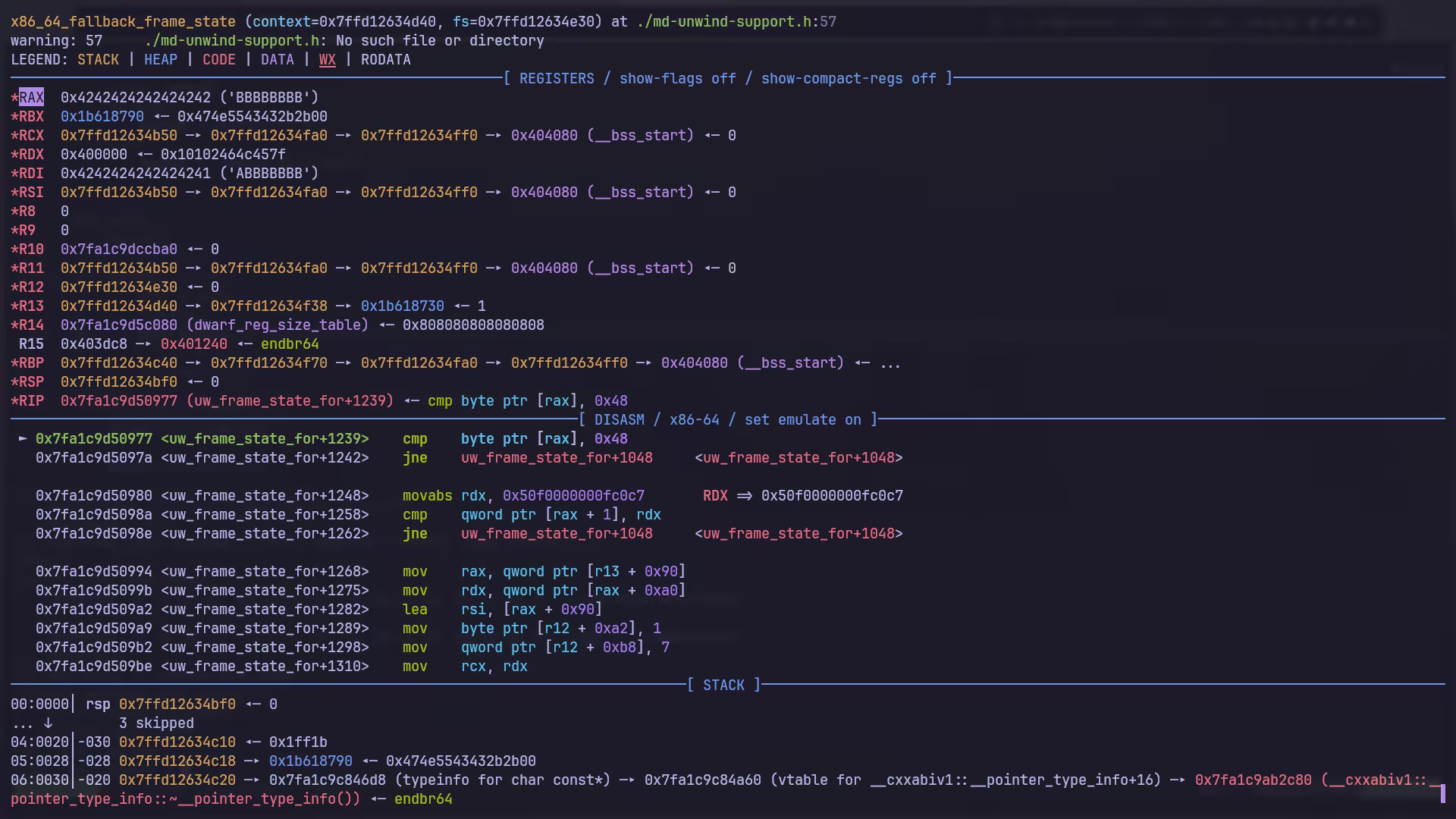 首先是只覆盖了 rbp,我们发现执行 _Unwind_Resume 前 rbp 是 0x7ffe29f72c50 ◂— 0x4242424242424242 ('BBBBBBBB'):