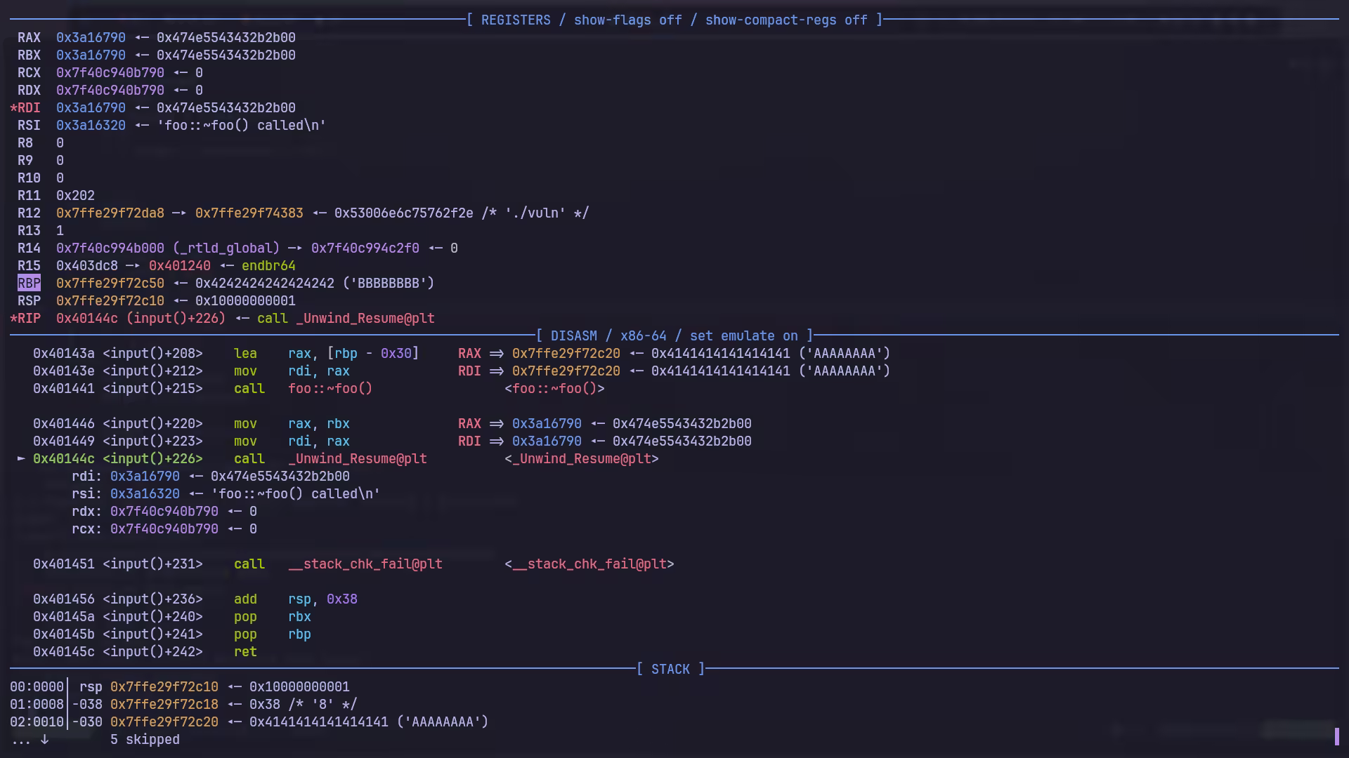 首先是只覆盖了 rbp,我们发现执行 _Unwind_Resume 前 rbp 是 0x7ffe29f72c50 ◂— 0x4242424242424242 ('BBBBBBBB'):