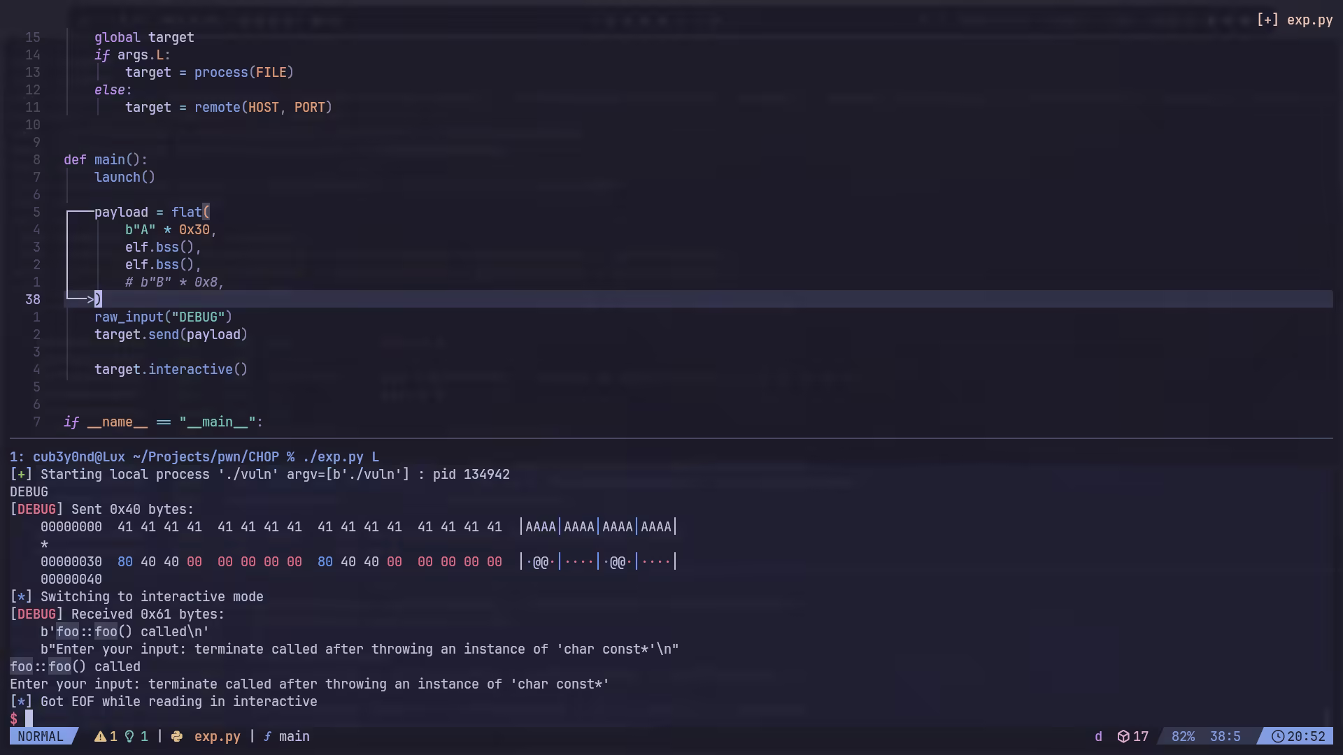 [DEBUG] Received 0x67 bytes: b'foo::foo() called\n' b'Enter your input: foo::~foo() called\n' b'String: Buffer overflow detected!\n' b'main() return\n'猜想有了,现在就付诸实践吧~