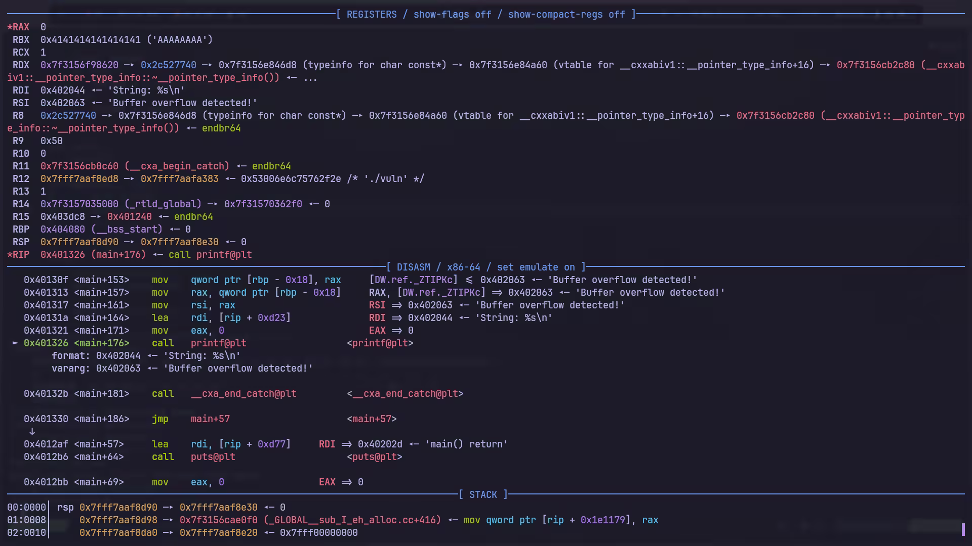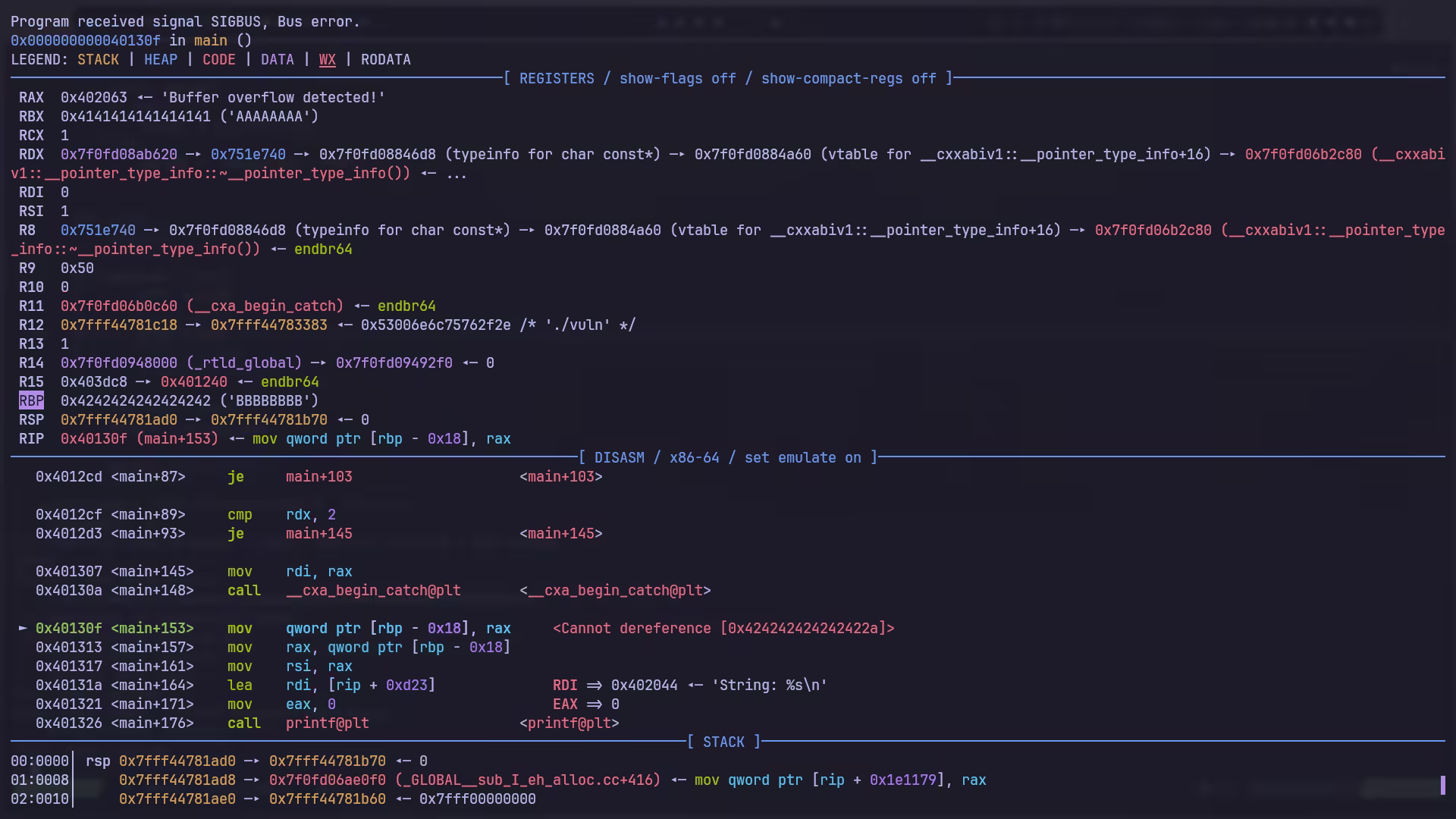 pwndbg> x/10i $rip=> 0x40130f <main+153>: mov QWORD PTR [rbp-0x18],rax 0x401313 <main+157>: mov rax,QWORD PTR [rbp-0x18] 0x401317 <main+161>: mov rsi,rax 0x40131a <main+164>: lea rdi,[rip+0xd23] # 0x402044 0x401321 <main+171>: mov eax,0x0 0x401326 <main+176>: call 0x4010e0 <printf@plt> 0x40132b <main+181>: call 0x401160 <__cxa_end_catch@plt> 0x401330 <main+186>: jmp 0x4012af <main+57> 0x401335 <main+191>: endbr64 0x401339 <main+195>: mov rbx,raxpwndbg> x/s 0x4020440x402044: "String: %s\n"pwndbg> x/s $rax0x402063: "Buffer overflow detected!"既然 rbp 只要是能 rw 的地址,程序又没开 PIE,那我们直接将其修改为 bss 的地址,就可以继续往下执行了: