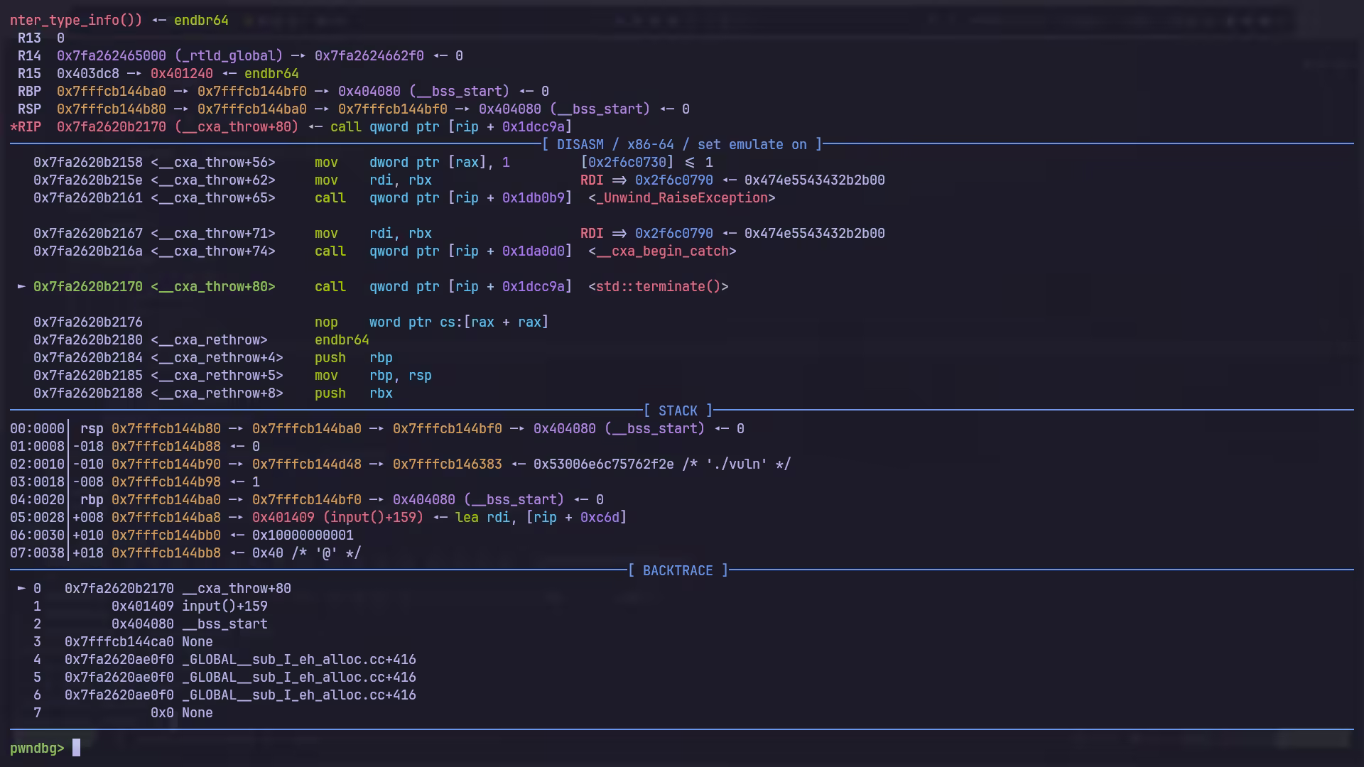 throw -> ___cxa_begin_catch -> executing handler -> ___cxa_end_catch -> resume after catch in input() -> destructor -> check canary -> ... - 抛出异常,但是当前函数中不存在对应的 cactch,那么执行路径将变为: