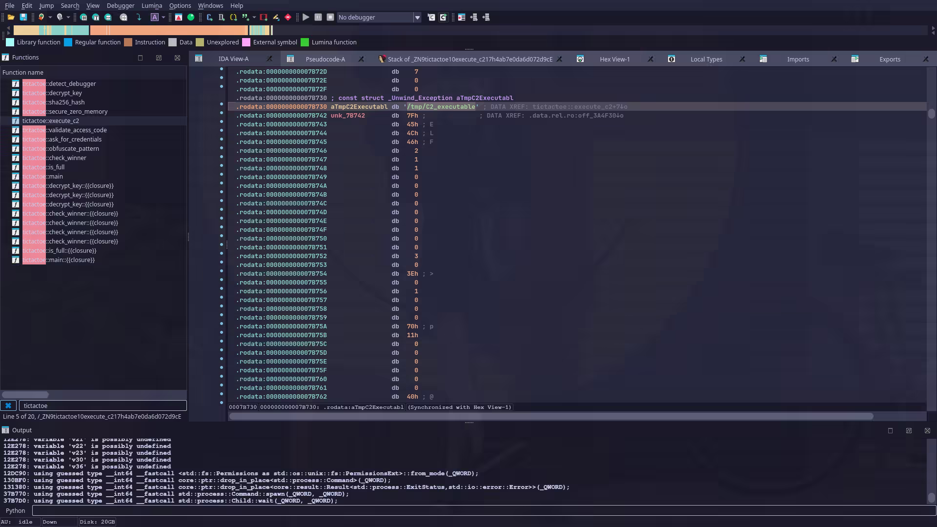 此时,我们的宏观目标已经是非常清晰的了,就是要搞清楚如何调用 tictactoe::execute_c2。一开始我想着可能有输入方面的漏洞,然后构造一个 ROP Chain 或者什么东西去调用它。不过我同时又清楚,Rust 以其安全性而扬名,所以题目如果是考察 Rust 的编码漏洞,那就未免有点太难了,虽然不排除确实有这个可能……总之,我在这一块还是浪费了将近一个小时,去研究 main 函数中对输入的处理是否存在什么漏洞,事实证明根本没有……