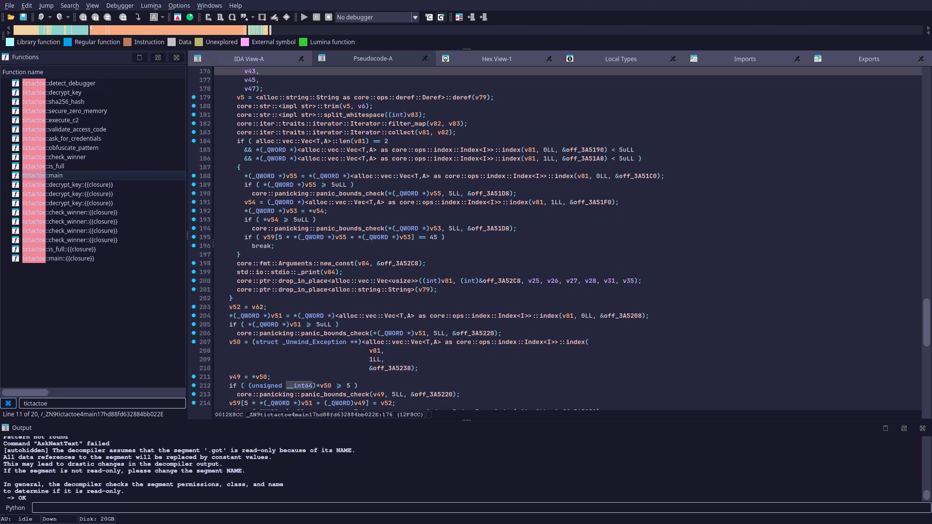 v80 = a2; tictactoe::obfuscate_pattern((int)v82, a2, a3, a4, a5, a6, v37, v40, v43, v46, v50, v52, v54, v59, v62, v64); alloc::string::String::new(v83); v6 = <alloc::vec::Vec<T,A> as core::ops::deref::Deref>::deref(a3); v76 = v7; v77 = (struct _Unwind_Exception *)v6; v8 = core::slice::<impl [T]>::iter(v6, v7); v72 = v9; v73 = v8; v10 = <I as core::iter::traits::collect::IntoIterator>::into_iter(v8, v9); v70 = v11; v71 = v10; *(_QWORD *)v84 = v10; *(_QWORD *)v85 = v11; while ( 1 ) { *(_QWORD *)v86 = <core::slice::iter::Iter<T> as core::iter::traits::iterator::Iterator>::next(v84); if ( !*(_QWORD *)v86 ) break; v87 = **(_QWORD **)v86; v88 = *(_QWORD *)(*(_QWORD *)v86 + 8LL); v89 = *(_DWORD *)(*(_QWORD *)v86 + 16LL); core::fmt::rt::Argument::new_display(&v94, &v89); core::fmt::rt::Argument::new_display(&v95, &v87); core::fmt::rt::Argument::new_display(&v96, &v88); v93[0] = v94; v93[1] = v95; v93[2] = v96; core::fmt::Arguments::new_v1(v92, &unk_3A5110, v93); alloc::fmt::format((unsigned int)v91, (unsigned int)v92); v90[0] = v91[0]; v90[1] = v91[1]; v90[2] = v91[2]; v35 = <alloc::string::String as core::ops::deref::Deref>::deref(v90); v41 = v36; v44 = v35; alloc::string::String::push_str(v83, v35, v36); core::ptr::drop_in_place<alloc::string::String>(v90); } v12 = <alloc::string::String as core::ops::deref::Deref>::deref(v82); regex::regex::string::Regex::new( (int)v101, v12, v13, v14, v15, v16, v38, v41, v44, v47, v51, v53, v55, v60, v63, v65, v66, v67, v68, v69, v13, v12, 0, v70, v71, v72, v73, v74, v75, v76, v77, a1); if ( !*(_QWORD *)v101 ) { v116 = *(_QWORD *)v103; v115 = *(_OWORD *)v102; core::result::unwrap_failed(aCalledResultUn, 43LL, &v115, &off_3A4EE0, &off_3A50D0); } *(_QWORD *)v97 = *(_QWORD *)v101; *(_QWORD *)v98 = *(_QWORD *)v102; *(_QWORD *)v99 = *(_QWORD *)&v102[2]; *(_QWORD *)v100 = *(_QWORD *)v103; v17 = <alloc::string::String as core::ops::deref::Deref>::deref(v83); if ( (regex::regex::string::Regex::is_match(v97, v17, v18) & 1) != 0 ) { v19 = &off_3A5100; core::fmt::Arguments::new_const(v104, &off_3A5100); std::io::stdio::_print(v104); if ( (tictactoe::validate_access_code((int)v104, (int)&off_3A5100, v31, v32, v33, v34) & 1) != 0 ) { tictactoe::ask_for_credentials(); v81 = 1; } else { v19 = &off_3A4FE8; core::fmt::Arguments::new_const(v105, &off_3A4FE8); std::io::stdio::_print(v105); v81 = 0; } } else { v106[0] = <I as core::iter::traits::collect::IntoIterator>::into_iter(0LL, 5LL); v106[1] = v20; while ( 1 ) { v21 = core::iter::range::<impl core::iter::traits::iterator::Iterator for core::ops::range::Range<A>>::next(v106); v61 = v22; v106[2] = v21; v107 = v22; if ( !v21 ) break; v108 = v107; if ( v107 >= 5 ) core::panicking::panic_bounds_check(v108, 5LL, (__int64)&off_3A50E8); *(_QWORD *)v109 = core::slice::<impl [T]>::iter(*(_QWORD *)v78 + 20 * v108, 5LL); v110 = v28; v19 = (char **)&v80; if ( (<core::slice::iter::Iter<T> as core::iter::traits::iterator::Iterator>::all( (int)v109, (int)&v80, v28, v109[0], v29, v30, (int)v39, v42, v45, v48, v28, v109[0], v56, v61) & 1) != 0 ) { v81 = 1; goto LABEL_21; } v111[0] = 0LL; v111[1] = 5LL; v112[0] = *(_QWORD *)v78; v112[1] = &v108; v112[2] = &v80; v19 = (char **)v112; v49 = core::iter::traits::iterator::Iterator::all(v111, v112); if ( (v49 & 1) != 0 ) { v81 = 1; goto LABEL_21; } } LODWORD(v19) = v78[0]; v113[0] = 0LL; v113[1] = 5LL; v58 = core::iter::traits::iterator::Iterator::all(v113, *(_QWORD *)v78, &v80); if ( (v58 & 1) != 0 ) { v81 = 1; goto LABEL_21; } LODWORD(v19) = v78[0]; v114[0] = 0LL; v114[1] = 5LL; v57 = core::iter::traits::iterator::Iterator::all(v114, *(_QWORD *)v78, &v80); if ( (v57 & 1) == 0 ) { v81 = 0; core::ptr::drop_in_place<regex::regex::string::Regex>((int)v97, v78[0], v23, v24, v25, v26, v39, v42); core::ptr::drop_in_place<alloc::string::String>(v83); core::ptr::drop_in_place<alloc::string::String>(v82); return v81 & 1; } v81 = 1; }LABEL_21: core::ptr::drop_in_place<regex::regex::string::Regex>((int)v97, (int)v19, v23, v24, v25, v26, v39, v42); core::ptr::drop_in_place<alloc::string::String>(v83); core::ptr::drop_in_place<alloc::string::String>(v82); return v81 & 1;}发现一个叫做 tictactoe::obfuscate_pattern 的函数。