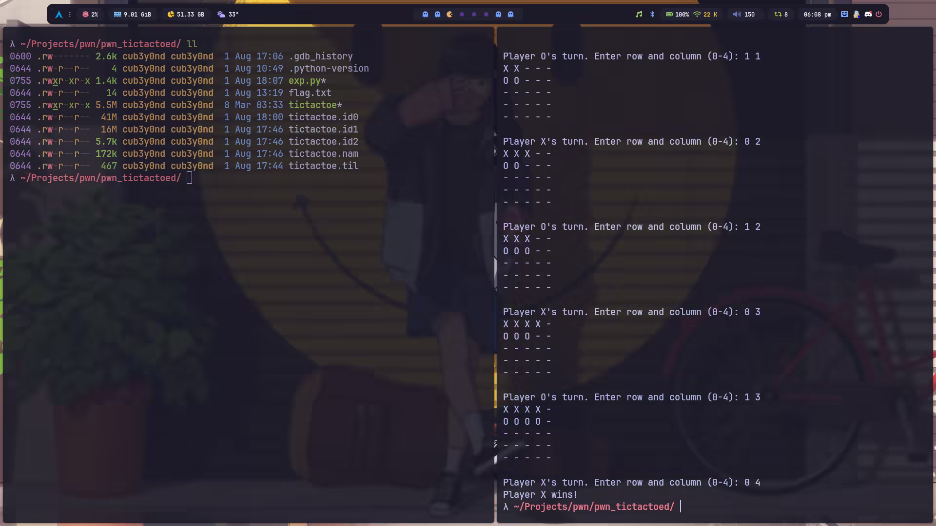 int __fastcall main(int argc, const char **argv, const char **envp){ return std::rt::lang_start(&tictactoe::main, argc, argv, 0LL);}第一次做 Rust Pwn,发现反汇编出来和 C 语法都差不多,先定位 main 函数,发现叫 tictactoe::main。根据我之前学过的那么一丢丢 rust 语法,tictactoe 应该就是这个程序的 crate 名。
