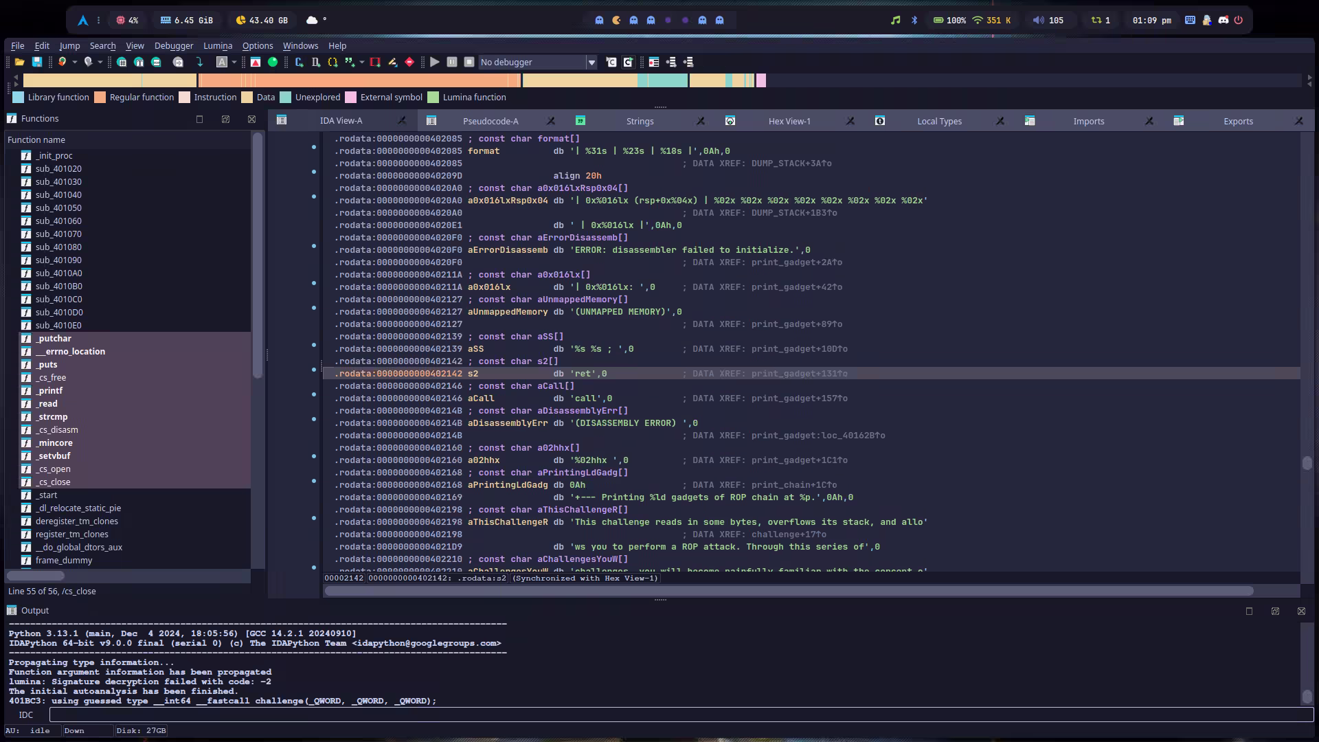 v5 = a1; v4[2] = a2; v4[1] = a3; v8 = __readfsqword(0x28u); puts( "This challenge reads in some bytes, overflows its stack, and allows you to perform a ROP attack. Through this series of"); puts("challenges, you will become painfully familiar with the concept of Return Oriented Programming!\n"); sp_ = (__int64)v4; bp_ = (__int64)&savedregs; sz_ = ((unsigned __int64)((char *)&savedregs - (char *)v4) >> 3) + 2; rp_ = (__int64)&retaddr; puts( "PIE is turned on! This means that you do not know where any of the gadgets in the main binary are. However, you can do a"); puts( "partial overwrite of the saved instruction pointer in order to execute 1 gadget! If that saved instruction pointer goes"); puts( "to libc, you will need to ROP from there. If that saved instruction pointer goes to the main binary, you will need to"); puts( "ROP from there. You may need need to execute your payload several times to account for the randomness introduced. This"); puts("might take anywhere from 0-12 bits of bruteforce depending on the scenario.\n"); v6 = read(0, buf, 0x1000uLL); printf("Received %d bytes! This is potentially %d gadgets.\n", v6, (unsigned __int64)&buf[v6 - rp_] >> 3); puts("Let's take a look at your chain! Note that we have no way to verify that the gadgets are executable"); puts("from within this challenge. You will have to do that by yourself.");3 collapsed lines